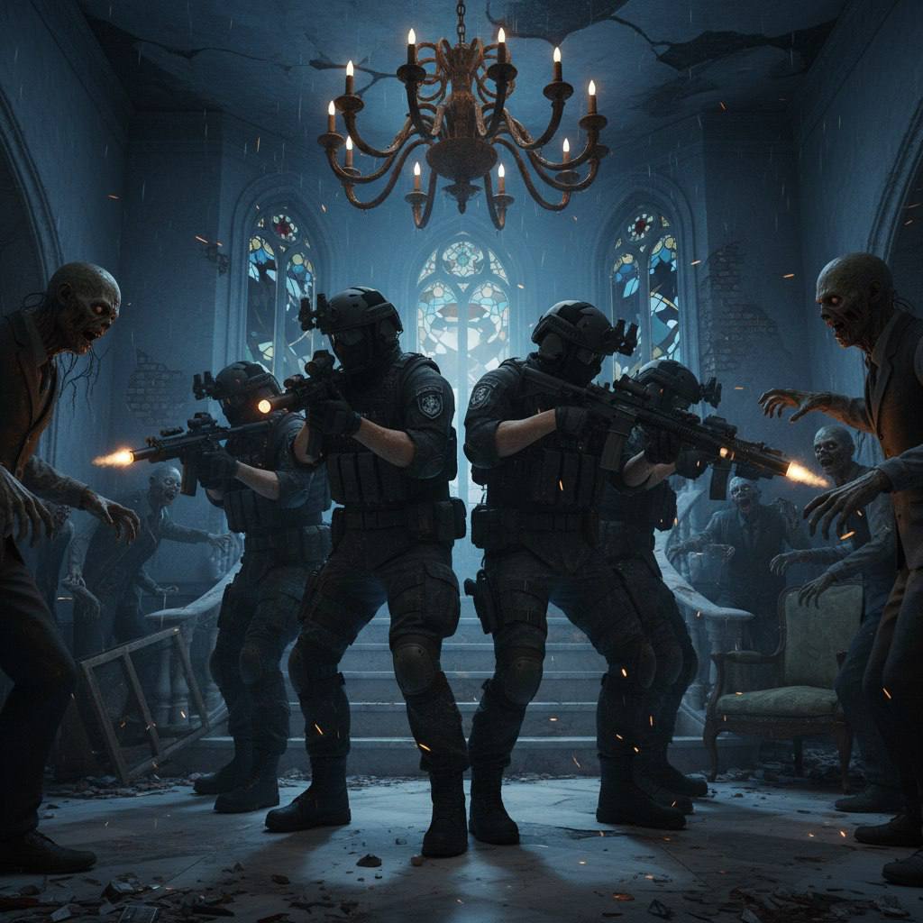 Вы — «Группа Браво», элита спецназа. Ваша цель — мрачный особняк, хранящий тайны «Амбреллы». Группа «Альфа», отправленная до вас, растворилась в тишине этого проклятого места. Их рации молчат, и только эхо ваших шагов будет нарушать этот ледяной покой.
